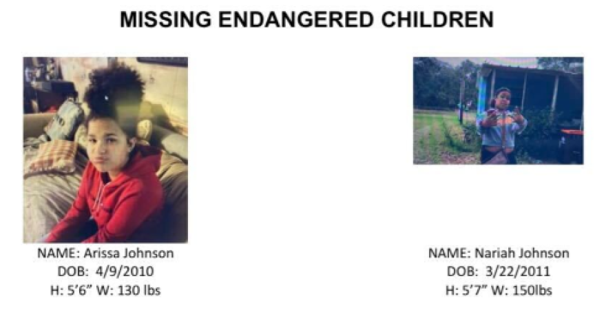 Arissa Johnson, 12, and Nariah Johnson, 11, were last seen Monday at 18722 Southeast 93rd Place, according to the media release. The Department of Children and Families said it believes the children were picked up by their biological mother, Amanda Via.