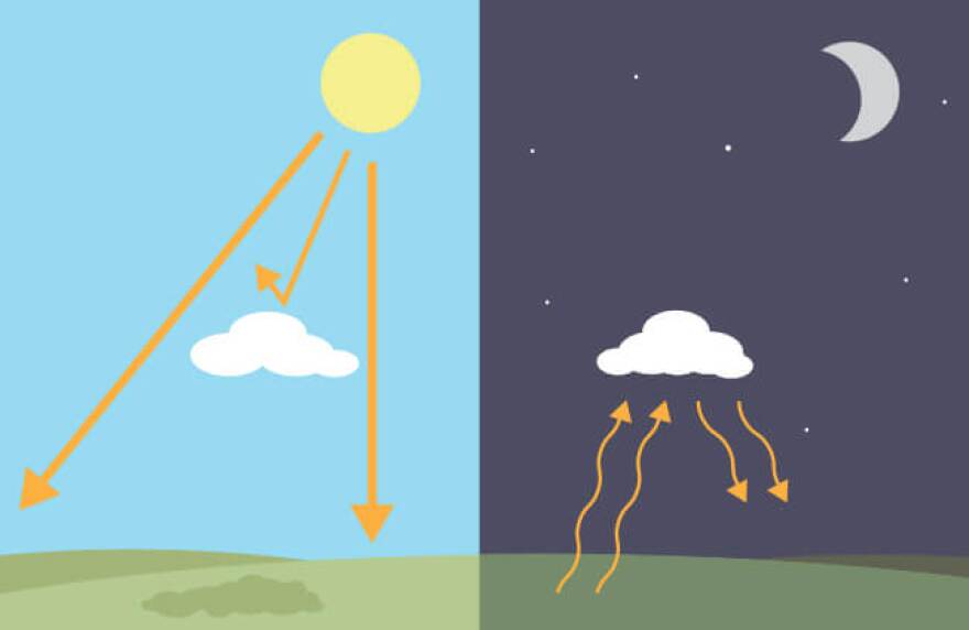 Clouds significantly impact the Earth’s temperatures, especially those closer to the surface. During the day, lower clouds, within a mile or so from the surface, usually tend to cool the earth´s atmosphere. These low, thicker clouds primarily reflect the Sun's heat, cooling the Earth’s surface. High clouds have the opposite effect; they tend to warm Earth more than cool it. There is an interesting effect at night: clouds tend to keep the Earth’s surface warmer by keeping the heat trapped. So, they act like a blanket.